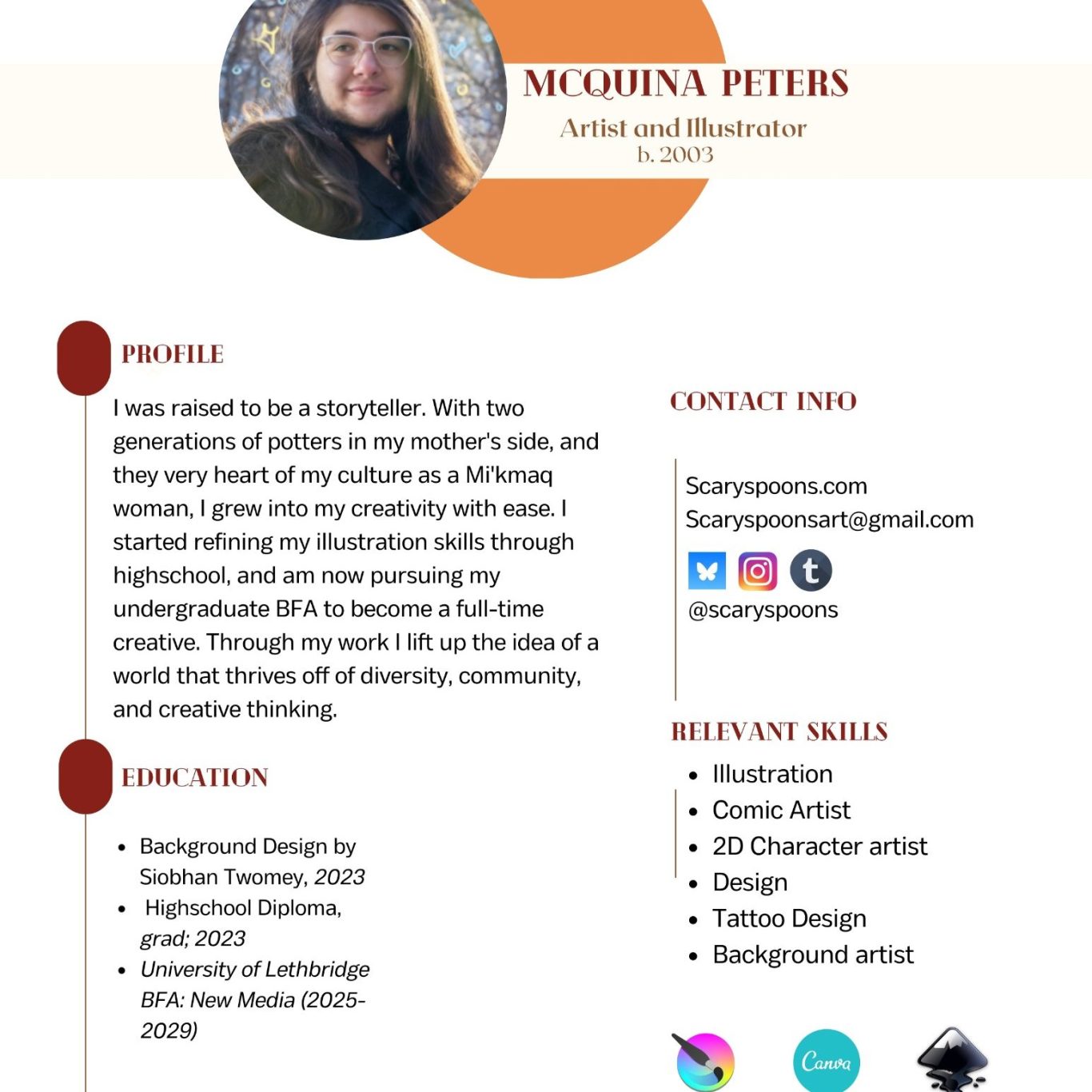 Born and raised in Treaty 7 Calgary, Alberta, McQuina's artistic vision draws inspiration from her rich and diverse cultural heritage. Her father's Mi'kmaq roots, and her mother's Scottish lineage have shaped her artistic identity, instilling a deep connection to all of her family lineage. McQuina's passion for preserving her cultural heritage fuels her quest to explore and learn more about her Mi'kmaq heritage, bridging the past with the present.